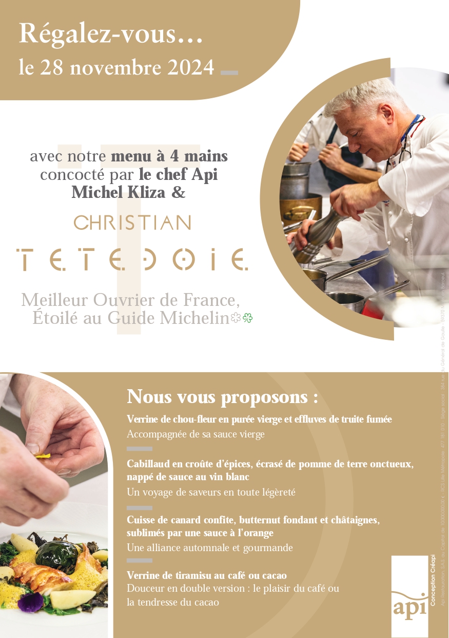 Depuis plus de 4 ans, le chef étoilé et MOF Christian Têtedoie et Api restauration forment un partenariat “la promotion Christian Têtedoie” pour mettre en exergue la créativité des chefs d’Api restauration. C’est à cet effet que le jeudi 28 novembre sera proposé un menu imaginé entre le chef étoilé et le chef Api Michel Kliza. Les convives du restaurant d’entreprise auront le plaisir de déguster un menu entièrement concocté et servi par le duo de chefs.